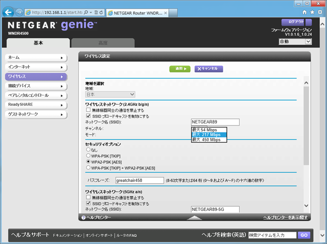 なお、無線関連では、このほか2.4GHz側の設定も確認しておくことをおすすめする。標準では2.4GHzの最大速度は217Mbpsに設定されており、20MHz幅しか有効になっていない。周辺の電波状況や電波のパワーを考慮すると、20MHz幅の方が高速に通信できる場合の方が多いので、標準設定のままでかまわないが、せっかくの2.4GHz 450Mbpsを活用したい場合は450Mbpsに変更しておくとよい。