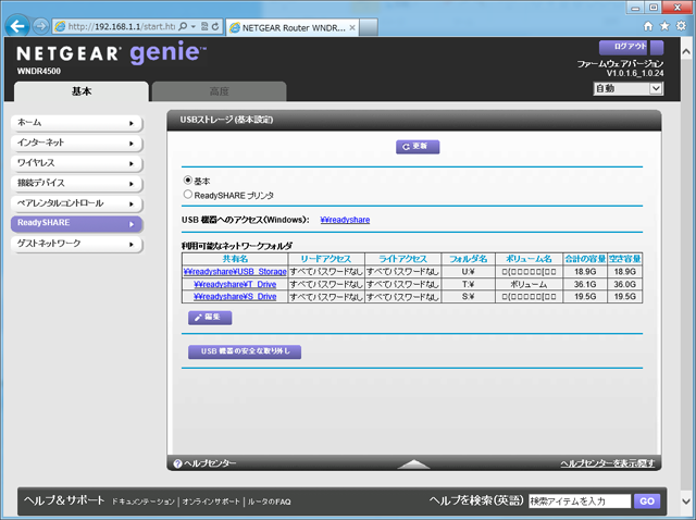 「ReadySHARE」には、ストレージ機器を共有する「基本」モードとプリンタ共有が可能な「ReadySHAREプリンタ」の2つのモードが用意されているが、標準で基本モードで設定されており、USBポートにFATやNTFSでフォーマットされたUSBストレージを接続するだけで、自動的に保存されているファイルを共有することができる。