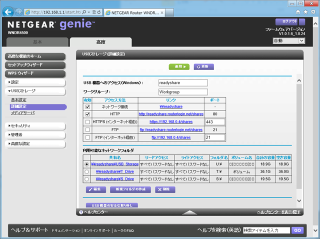 クライアントからのアクセスは、「\\readyshare」でアクセスできるが、これに加え「http://readyshare.routerlogin.net/shares/」からHTTPでアクセスすることもできるうえ、詳細設定でアクセスを有効にすればHTTPSやFTPでもアクセス可能になる。