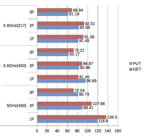 単位:Mbps2.4GHzに関しては、周辺に複数のアクセスポイントが存在するため、最高でも95Mbpsほどにとどまったが、5GHzに関しては、GETで最大136Mbpsと、実効で100Mbpsオーバーの速度を楽にマークした。