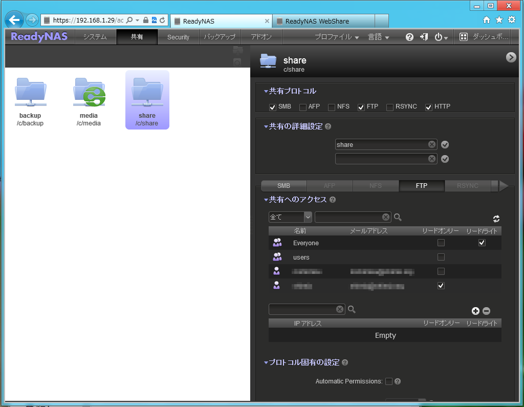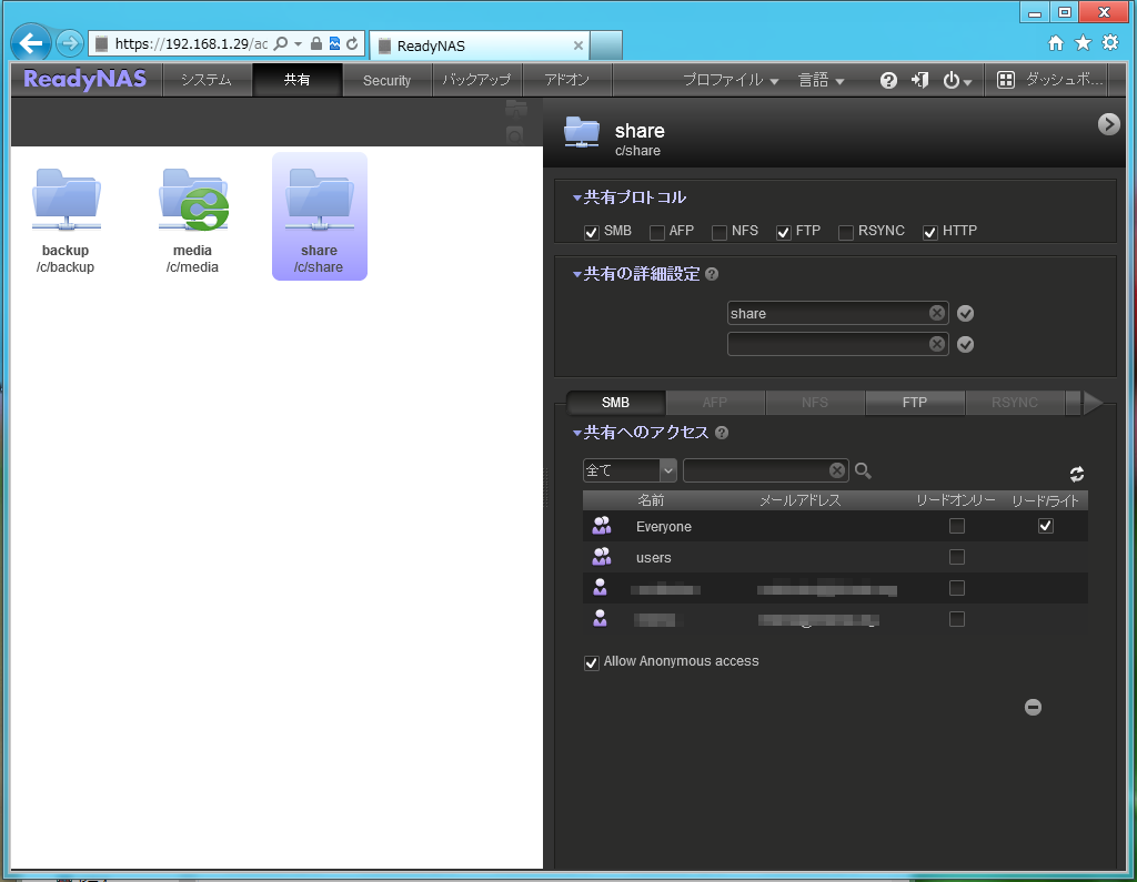たとえば、HTTPの場合、共有フォルダで「HTTP」にチェックをすれば、即座に共有が可能になる。ブラウザを利用して「http://IPアドレス/webshare」にアクセスすれば、HTTPを有効にした共有フォルダが表示される。スマートフォンやタブレットなどから共有フォルダのデータにアクセスしたいときなどに便利だ。