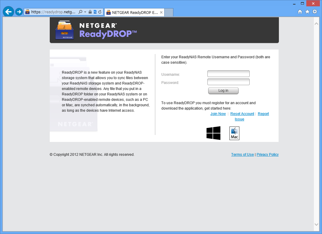 前述したように、ReadyDROPは、ReadyNAS Remoteの機能の1つとして提供されている。このため、まず実行すべきなのは、ReadyNAS Remoteのアカウントの取得だ。PCから「https://readydrop.netgear.com/」にアクセスし、「Join Now」をクリックして、アカウントを取得する。