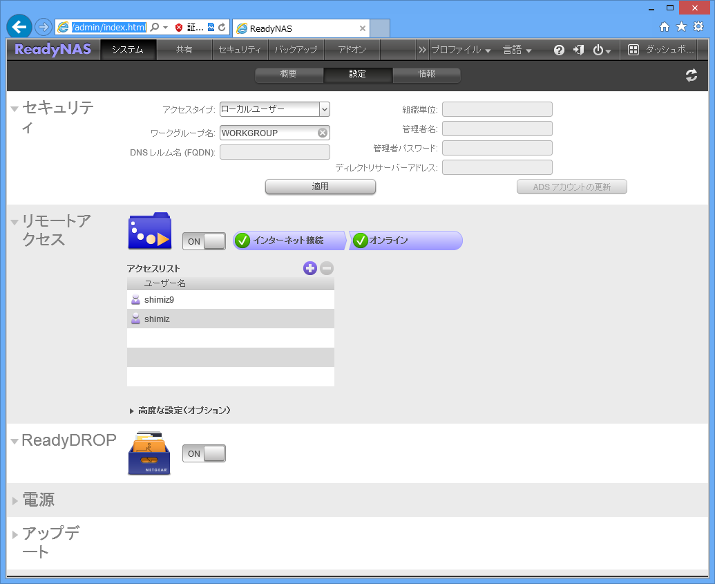 アップデートが完了したら、設定画面を表示し、「システム」の「設定」から「Remote Access」と「ReadyDROP」を有効にする。そして、Access Listの一覧で「+」ボタンをクリックし、1.で登録したユーザーを追加する。メールアドレスを入力するとアカウントが表示されるので、追加しておこう。