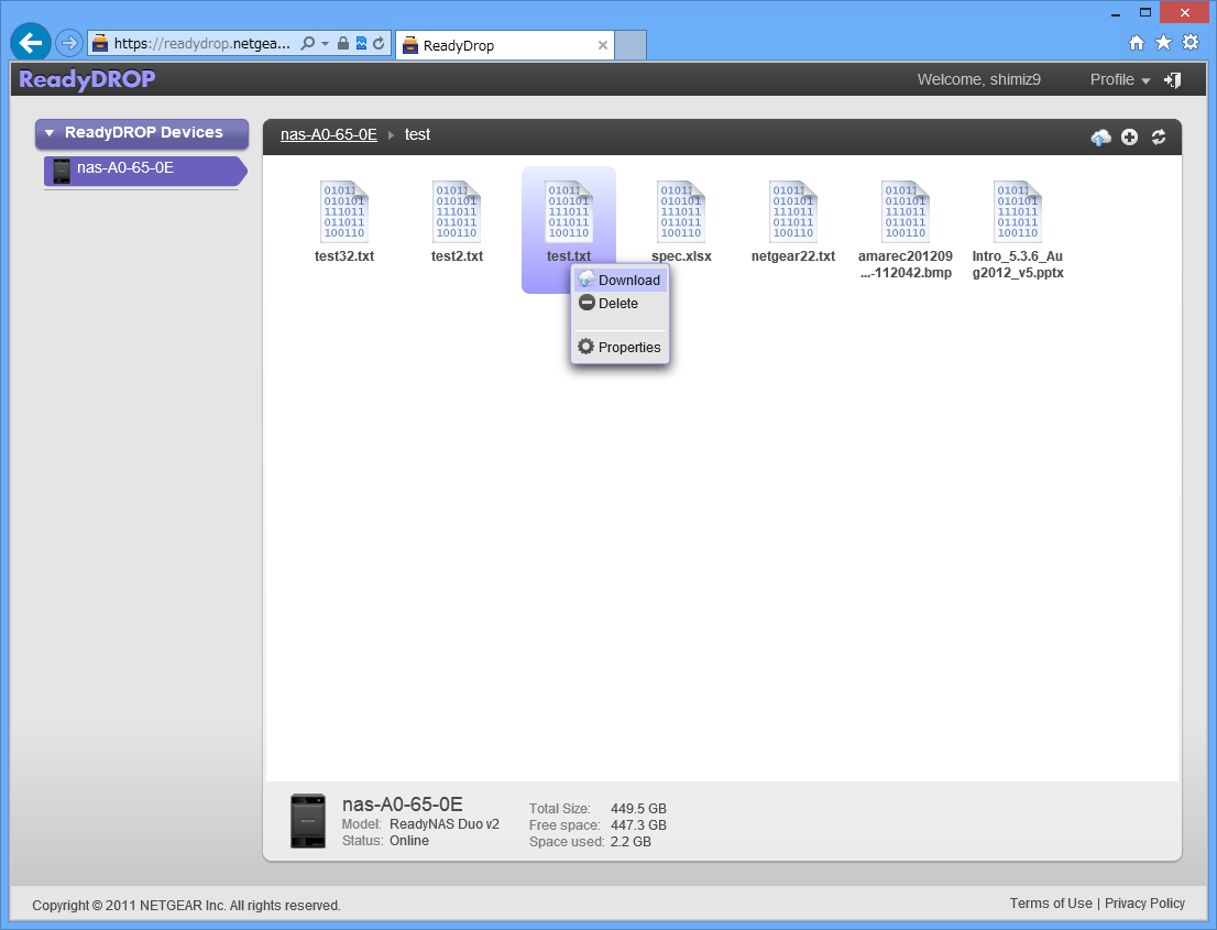個人的には、やはりWAN経由での同期は環境に依存するため、基本的に同期はLANで実行し、外出先から利用する際はブラウザからアクセスするという使い方が適しているのではないかと感じた。「http://readydrop.netgear.com」からログインすれば、PCで同期されたファイルにブラウザからアクセスすることができる。外出先で利用する場合は、ここからデータをダウンロードするのが効率的だろう。