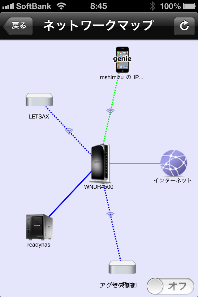 無線LANルーターに接続されている端末をグラフィカルに表示可能。PCやNAS、スマートフォン、タブレットなど、それぞれのアイコンで表示することも可能。ネットワーク上に存在する機器をひと目で確認できる。