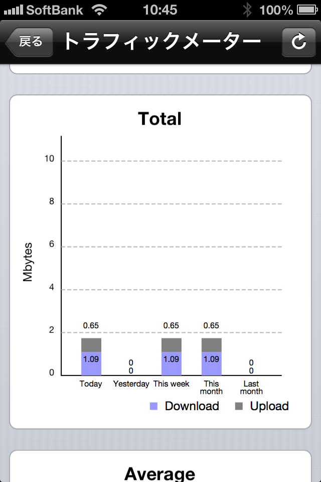 ネットワークのトラフィックをMB単位でグラフ表示することが可能。日別のトータルの転送量を表示できるのはもちろんのこと、週間の平均も表示可能。