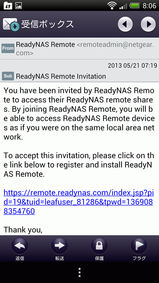 - メールを受け取った第三者はリンクをクリックしてユーザー登録を実行すれば、ReadyNAS Remoteのサービスを使えるようになる。