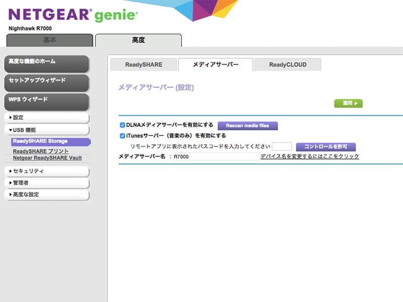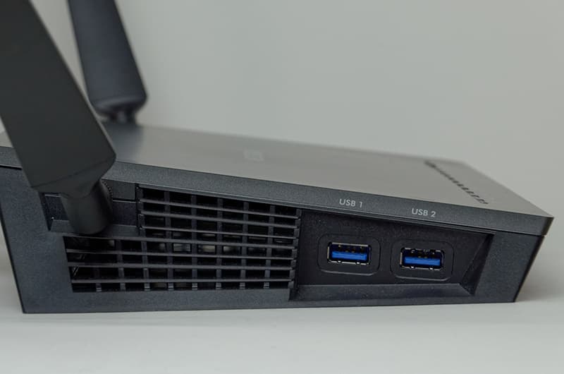 個人的に推したいのは、ネットワーク上に配置するストレージ「NAS」にファイルを保管し、そこからDLNAというメディアデータのストリーミング配信の仕組みを用いて再生する形だ。R7000は、HDDこそ内蔵していないが、USB 3.0とUSB 2.0ポートを1個ずつ備えていて、ここに外付けのUSB HDDを接続することでNASとして機能するようになっている。接続したHDDはネットワークドライブとしてPCなどからアクセスできるので、単純にハイレゾ音源をコピーするだけで準備OKだ。