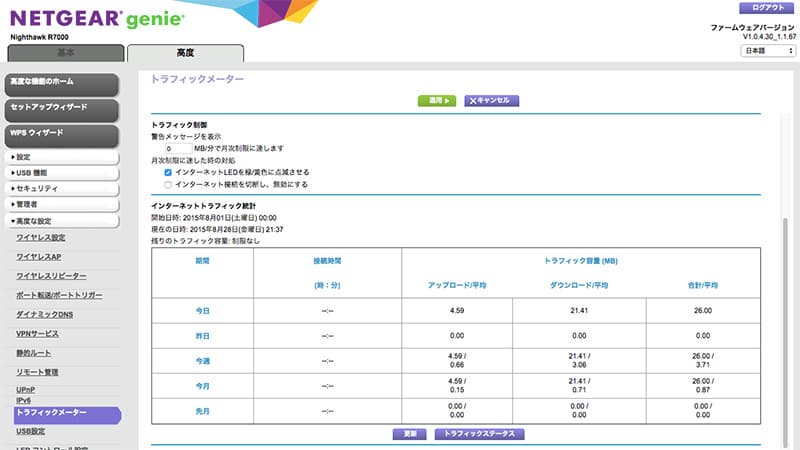 また、モバイルルーターには1カ月間のデータ通信量を表示する機能が設けられていたりするが、R7000は「トラフィックメーター」機能を用意していて、指定した月次制限に達すると本体LEDで教えてくれたり、当日・昨日・今週・今月・先月のデータ通信量の統計も分かるようになっていて、「直近3日間以内の通信量が○GBを超えたら速度制限」が回線業者によって設けられている場合でも、ある程度制限に到達しそうかどうかが把握しやすいのもうれしいところだ。