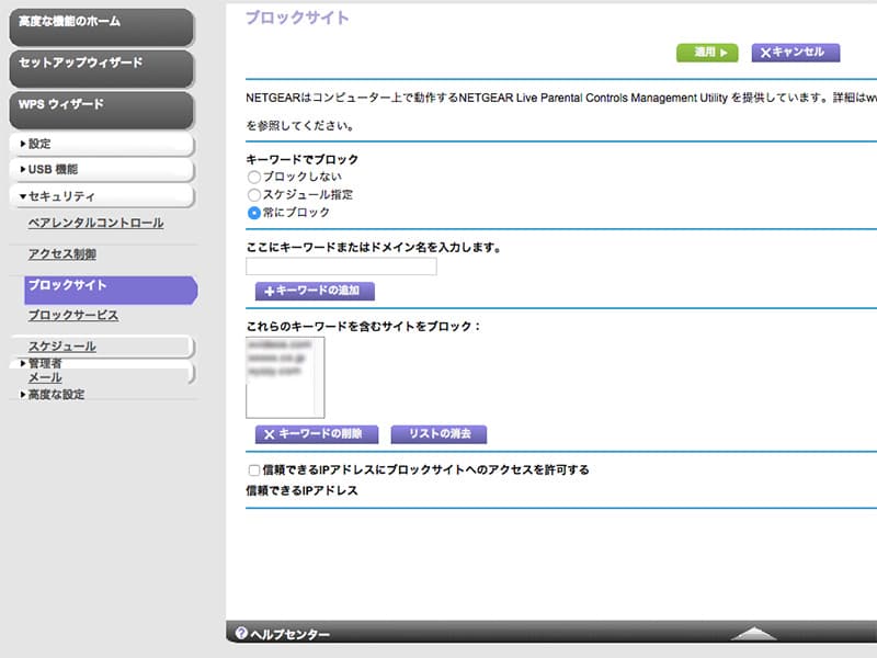 それと、子どものいるファミリー向けに欠かせないのが、他の2機種も搭載している「ペアレンタルコントロール」や「ブロックサイト」「ブロックサービス」といったセキュリティ機能だ。ペアレンタルコントロールでは、フィルタリングのレベルを選ぶか、あらかじめ用意されたWebコンテンツカテゴリーのうち、アクセスさせたくないカテゴリーを選択するだけでフィルタリングが可能。ブロックサイトでは、指定したドメインへのアクセスを遮断し、ブロックサービスは、特定のIPアドレスの機器(PCやスマートフォン)上で、特定のポートを利用するアプリケーションなどの通信を不可能にする。子供の安全を考えるなら、これらもぜひ活用したい機能だ。