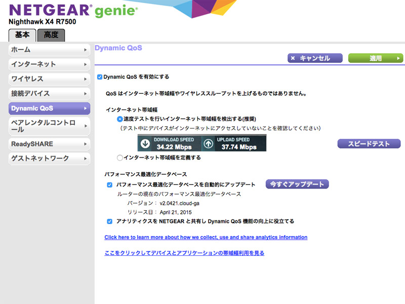 これにより、ゲームも動画再生などが快適になり、裏を返せば帯域をそれほど必要としないWebブラウジングのような他の通信も最適化される。使い方は、R7500の管理画面で「Dynamic QoS を有効にする」をチェックするだけ。動的に帯域を割り当てるには、日々世の中で増え続ける新たなアプリケーションやサービスもシステムとして把握していなければならないが、R7500ではこれを独自のデータベースで管理しており、しかも自動で更新するため、ユーザーはコンテンツの種類を意識することなく常に最高の状態で通信できる。