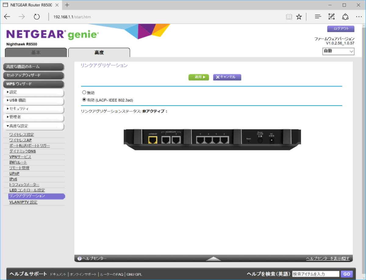 Nighthawk X8 R8500は標準でポート1とポート2のLAGが有効になっているので、NAS側でリンクアグリゲーション(チーミングやポートトランクと記載される場合もある)を有効にし、実際にLANケーブルを2ポートに接続する。