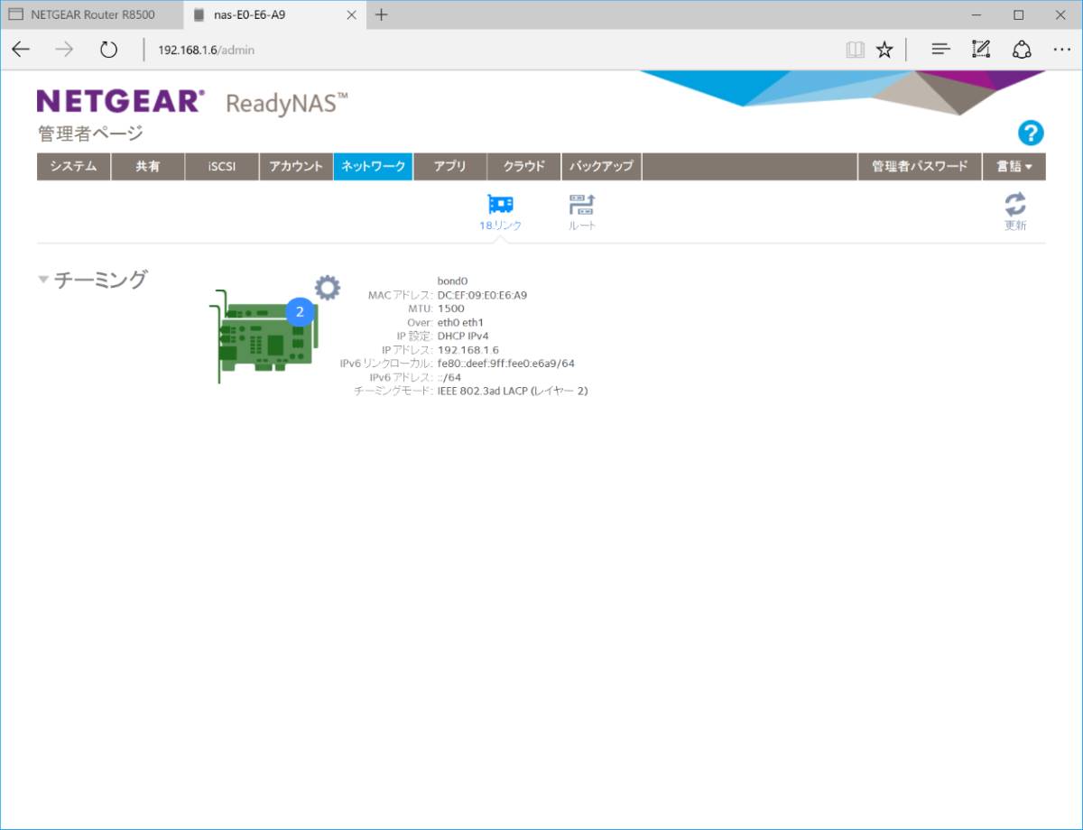 同じくリンクアグリゲーションに対応したNAS側でネットワーク設定をすれば1Gbps×2を活用できる