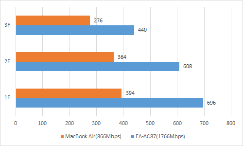 EA-AC87との相性の問題か、テスト中の最大リンク速度が1300Mbpsまでしか上がらず、1階でも最大696Mbpsとあまり高い速度は実現できていない。