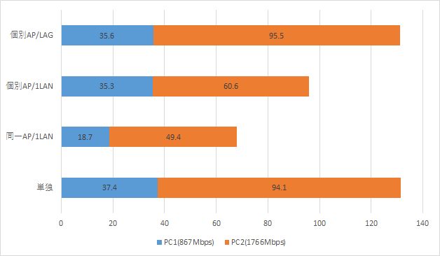 最後に有線のリンクアグリゲーションも併せて有効にしたのが「個別AP/LAG」だ。この結果では、867Mbpsのクライアントはそのままの速度だったが、1766Mbpsのクライアントは95.5MB/sと単独通信のときと同等の速度を実現できた。