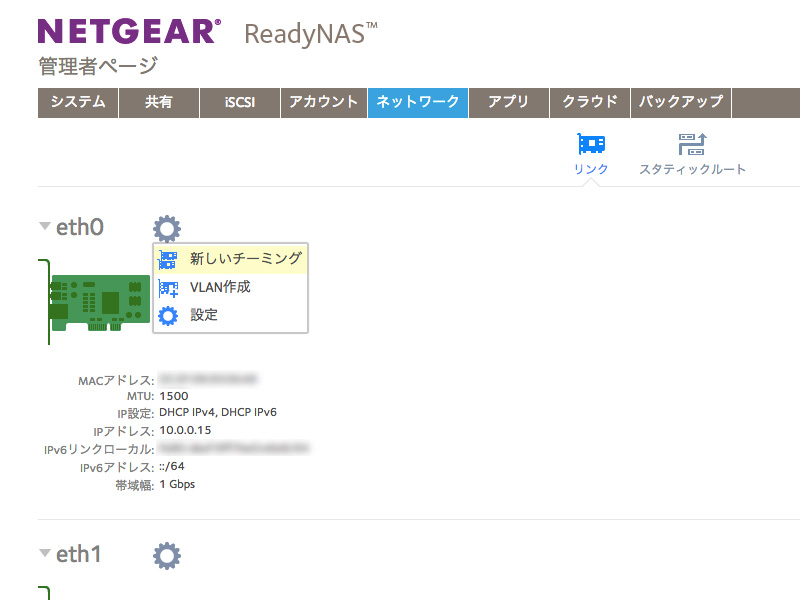チーミングの設定は、主にReadyNAS 212上で行う。管理画面の「ネットワーク」タブで2つのインターフェースが稼働している(接続状態である)のを確認してから設定ボタンを押し、「新しいチーミング」を選択。その後の設定画面で「チーミング」のチェックボックスをオンにし、「チーミングモード」を選択するだけだ。