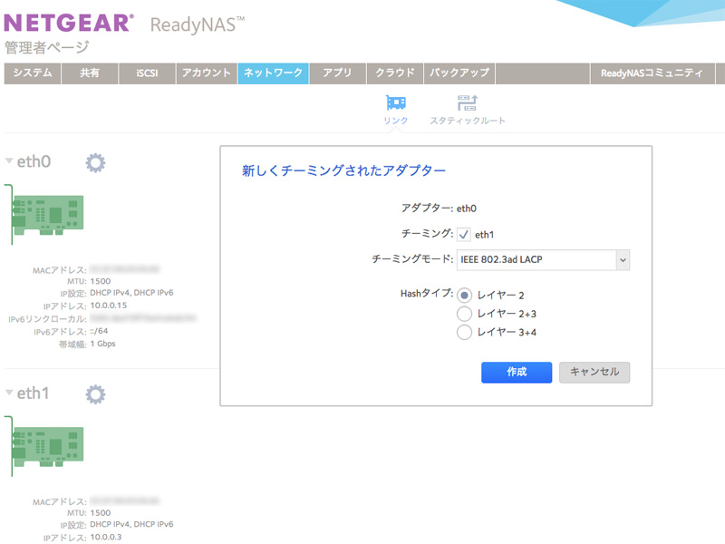 ReadyNAS 212では、この「チーミングモード」というところでリンクアグリゲーションとするか、あるいはフォールトトレランスやロードバランシングにするかを選べる。今回は家庭内でこれ以上にネットワーク(ルーター・NAS間)の信頼性を高める必要もないと判断し、一般的なリンクアグリゲーションの1方式である「IEEE 802.3ad LACP」を選び、ハッシュタイプには「Layer 2」を選択した。