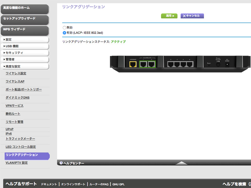 最後に、念のためR8500の管理画面にもアクセスして、「リンクアグリゲーション」の設定が有効であり、かつ「アクティブ」になっていることを確認して設定完了となる。