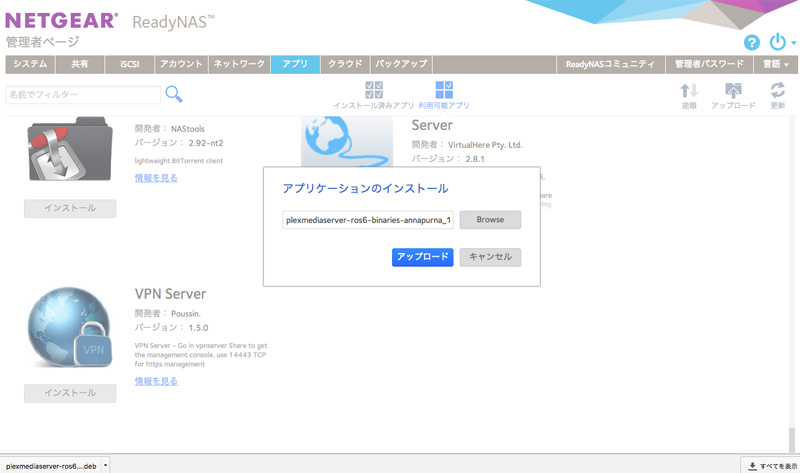 ReadyNAS 212の管理画面の「アプリ」から「アップロード」することでインストール完了