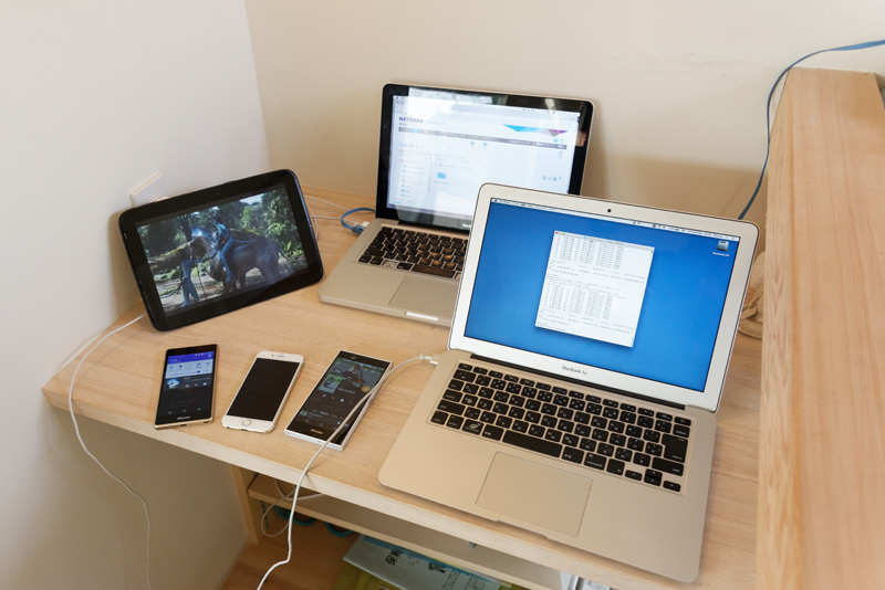 そんなわけで、R8500とReadyNAS 212のリンクアグリゲーションによるアドバンテージをちょっとだけ実感してみるため、家庭内の端末すべてを同時に使用し、それぞれの通信に影響がないかをチェックしてみた。使用した端末と通信の方法は以下のとおり。