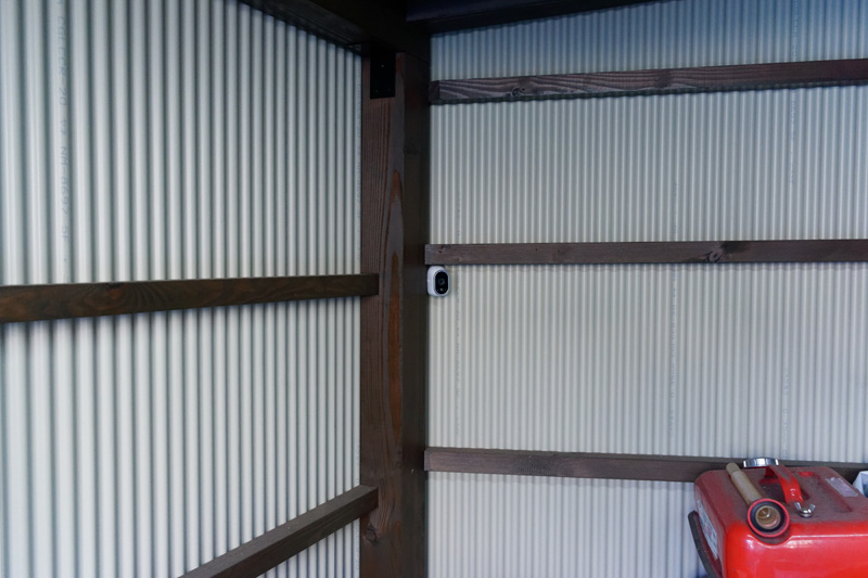 屋外の駐輪場の壁にマグネットで貼り付けたArlo。屋根付きなので雨がかかったりすることはほぼないが、防水なのはやはり安心