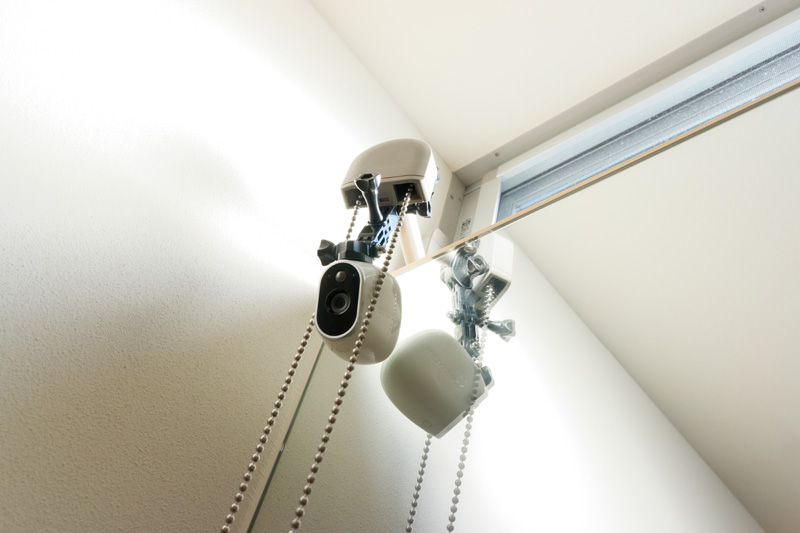 というわけで、屋外の駐輪場に設置したArloは、駐輪場の壁材がガルバリウム鋼板ということもあり、Arloの内蔵マグネットを活かして壁の隅に貼り付け。玄関のArloは三脚穴にGoProのマウント用アームを組み合わせ、窓開閉用チェーンのアームにぶら下げる形で取り付けた。Arlo Qはガス台上のレンジフードにそのまま乗せている。