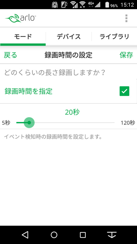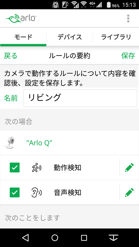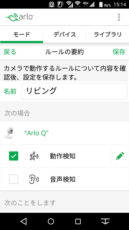 設置時に限らず、カメラ映像の視聴は、もし状況に大きな変化がなくても見ているだけで楽しかったりする。ただ、外出中は頻繁に映像を確認するわけにもいかないし、場合によってはモバイルネットワークの電波が弱い地域を通過することもあるだろう。なので、お出かけする前に(後でもよいが)必ず設定しておきたいのが、映像などに変化があった際に通知などを行う動作モード設定。Arloは、映像をずっと目で直接監視していなくても、なんらかの怪しい動きがあった時はすかさず教えてくれるのだ。