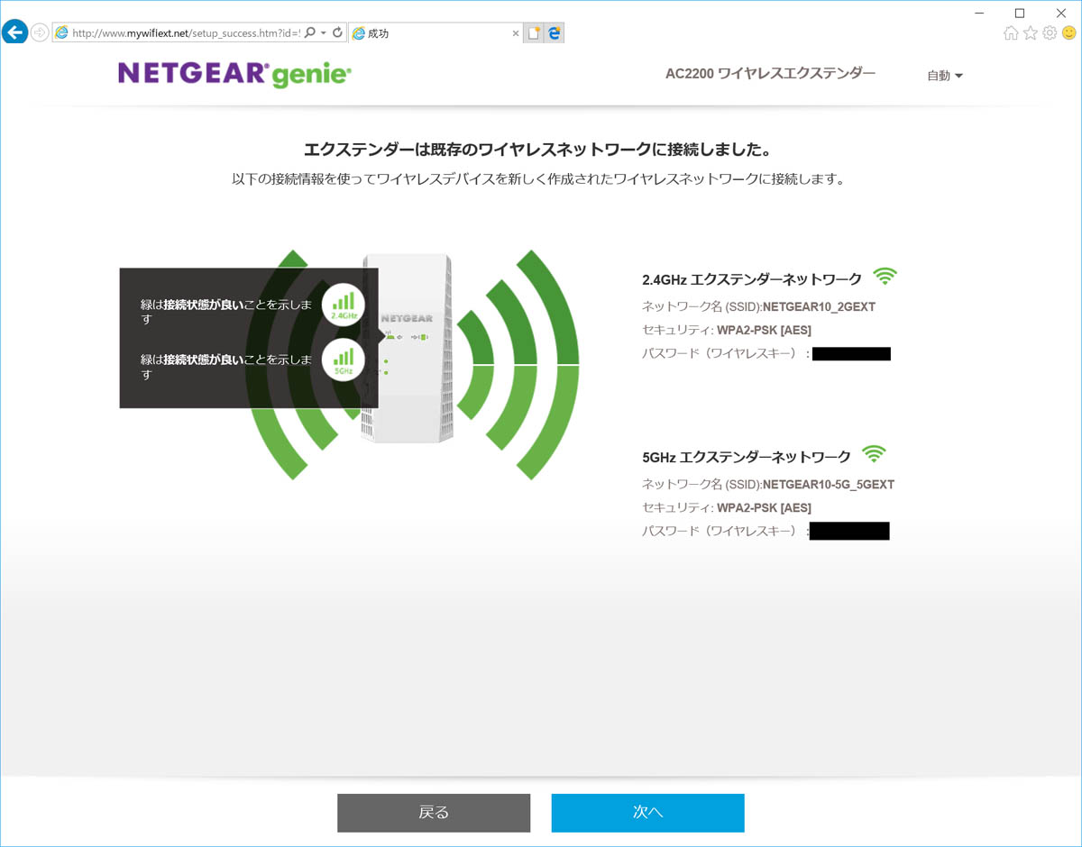 親機のSSIDの末尾に「_5GEXT」「_2GEXT」が付加されたSSIDが設定され、パスワードは親機からそのまま継承される