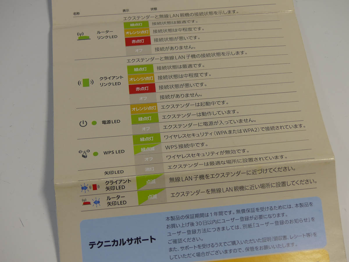 付属のマニュアルに記載されているLEDの状態説明。幸い筆者宅では表示されなかったが、電波状況が悪い場合は、クライアントと親機のどちらの方向に移動させればいいかも表示することが可能