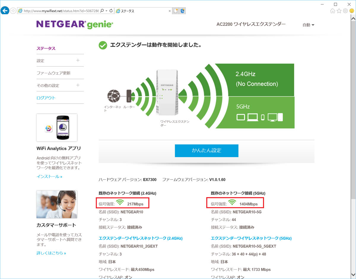 セットアップ画面を表示することで、親機とどれくらいの速度でリンクしているかも簡単に確認できる