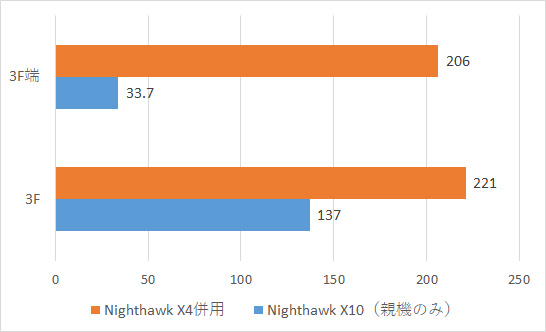 親機のみの場合、3階では階段付近で137Mbps、親機からもっとも遠くなる窓際で33.7Mbpsという速度(iperfによる計測)となっていたが、Nighthawk X4を設置することで、この値が221Mbpsと206Mbpsに向上している。