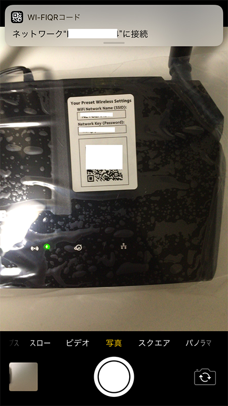 本体保護のために被せられたフィルムに、QRコードが書かれた設定用シールが貼り付けられているのだが、iOS11以降を搭載したiPhoneであれば、このQRコードをカメラアプリで読み取るだけで、無線LANへの接続設定が完了する。