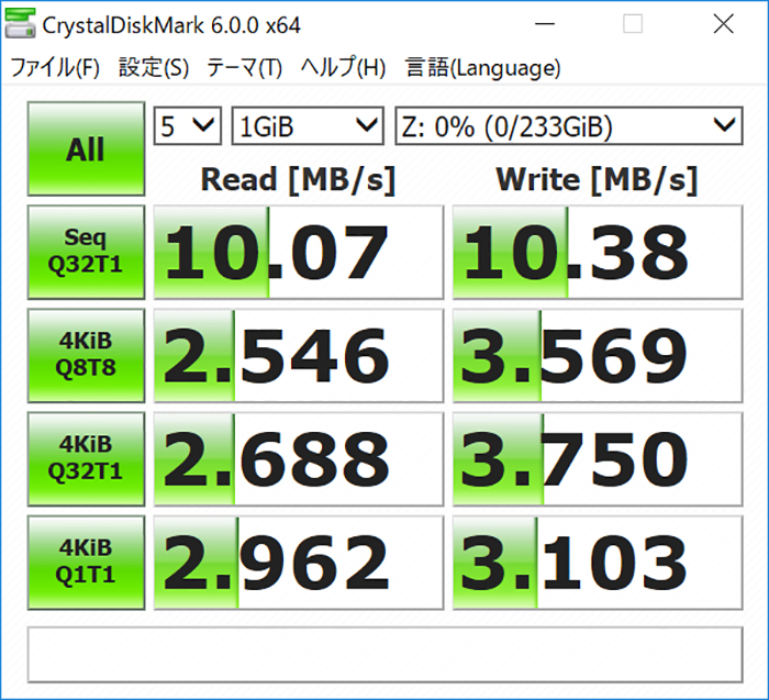 USB接続のSSDに対して、有線LAN接続のPCからCrystarlDiskMark 6.0.0を実行したところ。速度はさほど高くないが、家庭内のファイル共有などは問題ない