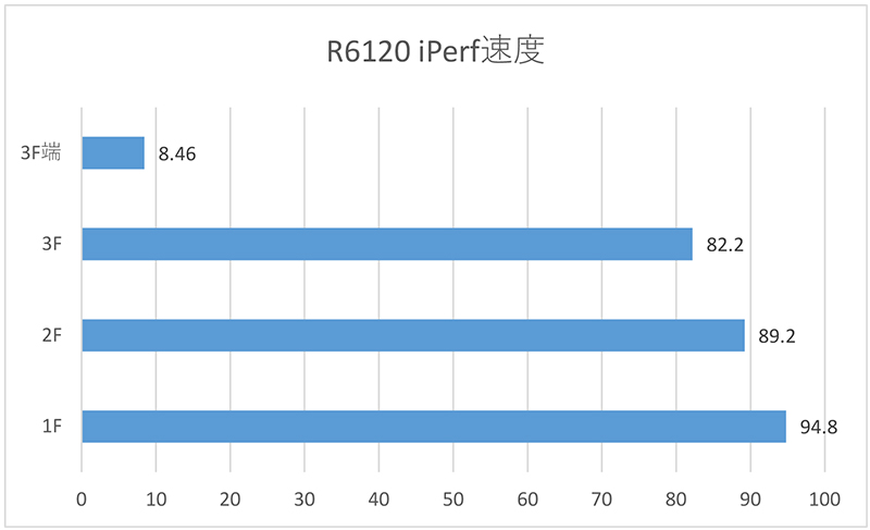 以下の表は、木造3階建ての筆者宅の1階にR6120を設置し、各階での速度を計測したものだ。有線LANで接続したPCに対してiPerfを実行しているため、1階では上限となる100Mbps近くの速度が発揮できている。
