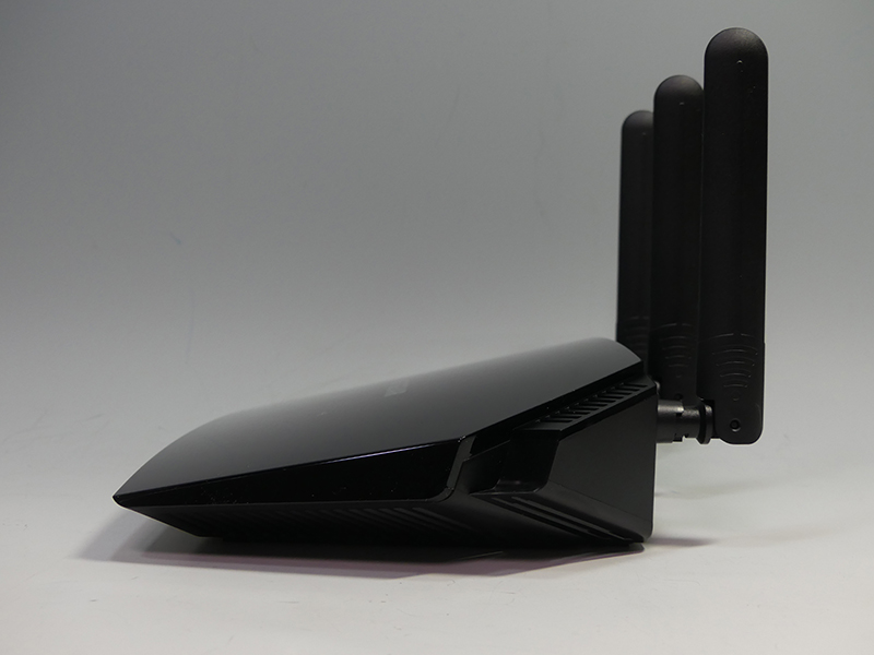 アンテナは外付けで背面に3本搭載されているが、こちらもサイズがさほど大きくないため広げてもあまり邪魔にならない。最近の無線LANルーターは、アンテナレスか、巨大な外付けかという二極化する傾向があるが、本製品は本体とのバランスが取れたちょうどいいサイズと言える。