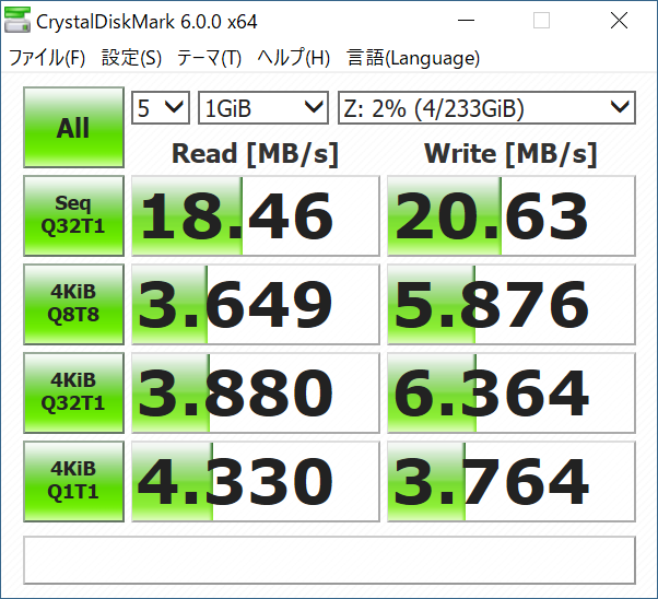 R6850のUSBポートにSSDを接続し、有線接続のPCからCrystalDiskMarkを実行した結果。USB2.0接続なのであまり速度は速くないが、家庭内でのファイル共有には十分