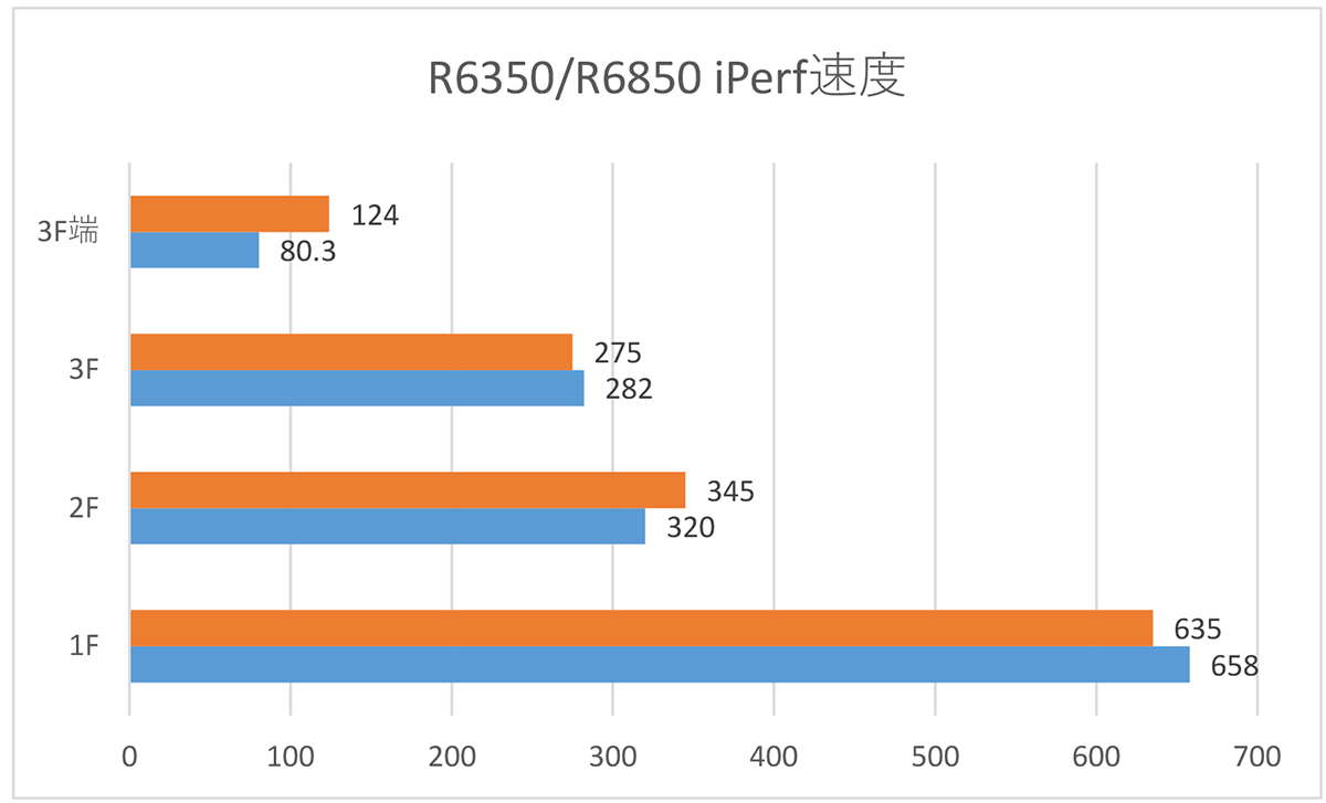 以下は、木造三階建ての筆者宅にて1階にR6350/R6850を設置し、各フロアでiPerfによる速度テストを実行した結果だ。2ストリーム866Mbps対応のクライアントを使っているため、近距離での最大速度が600Mbps前後で頭打ちになっているが、長距離での速度が予想以上に高い。