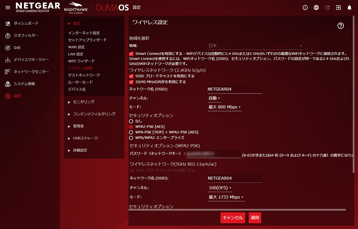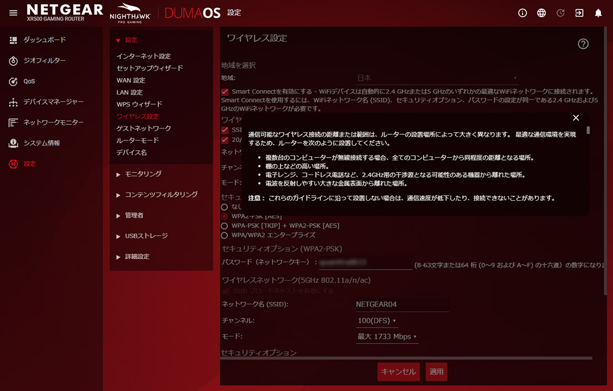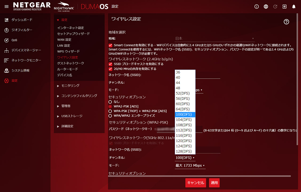切り替え時、通常は1分間にわたって利用できなくなるなど使い勝手の面で不都合が多いため、DFSは他のWi-Fiルーターではあまり積極的に活用されていない。しかし、混雑し始めている通常の5GHz帯より帯域が広く、なにより空いていることから、うまく活用できれば高速に通信できる。XR500では、52~140までの最大15種類のチャンネルから選べるため、日本ではほとんどレーダーの使用が検出されることのないチャンネルを指定しておけば、さらなる高速・安定通信が期待できるはずだ。