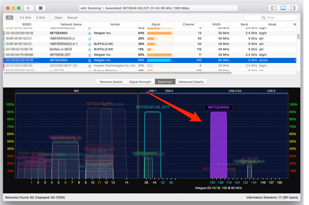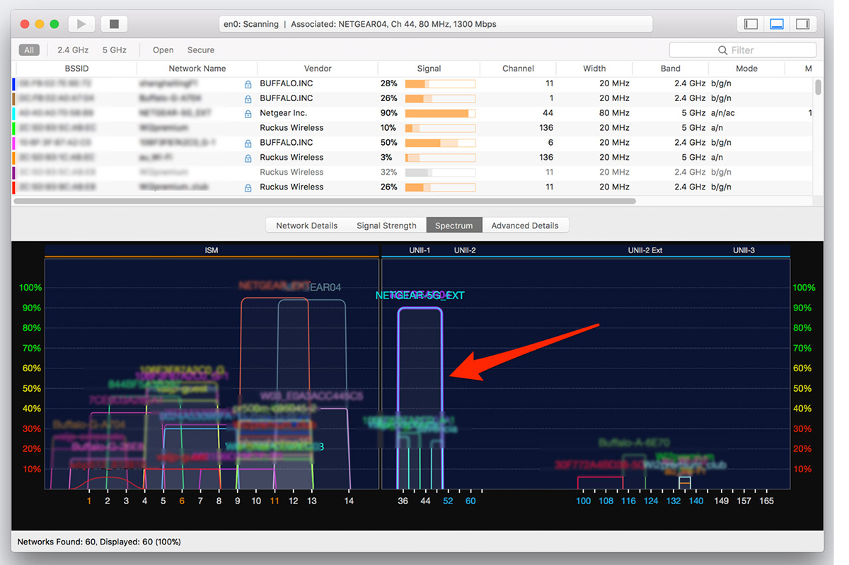 デフォルトの44チャンネルでは5GHz帯とはいえ混雑が激しいが…… 100チャンネルあたりは空いている