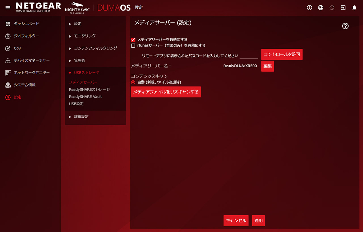 管理画面で設定を有効にすることで、外付けHDDと組み合わせてメディアサーバー、iTunesサーバー、NASとしても使えるように