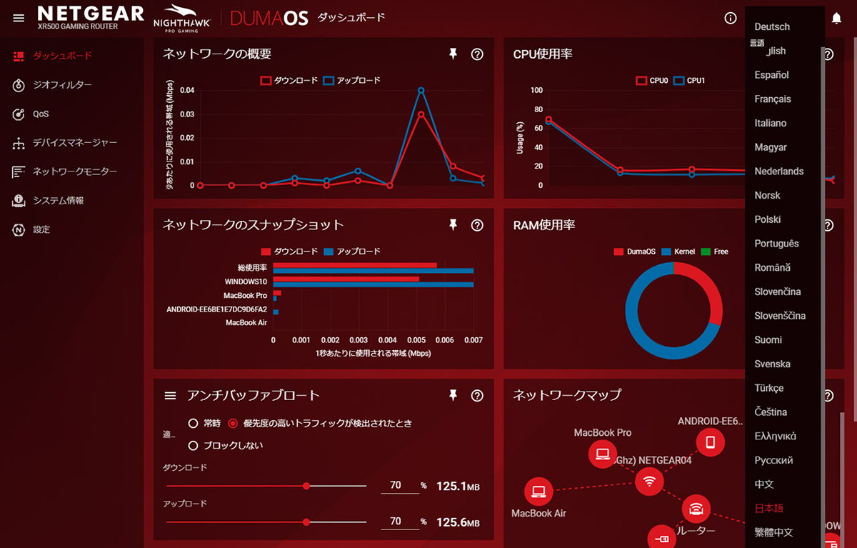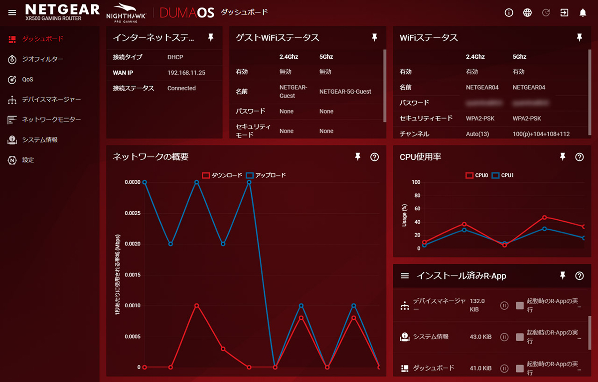 スペック面だけ見ると、XR500は高性能をウリにしているのか、と思われるかもしれない。が、それだとゲーム向けではない十分に高性能化が進んだ一般のWi-Fiルーターと大差のないものになってしまう。そこで見てほしいのがXR500の管理画面だ。管理画面を開くと、なぜゲームユーザーにはゲーミングWiFiルーターがいいのか、という疑問がたちどころに氷解する。