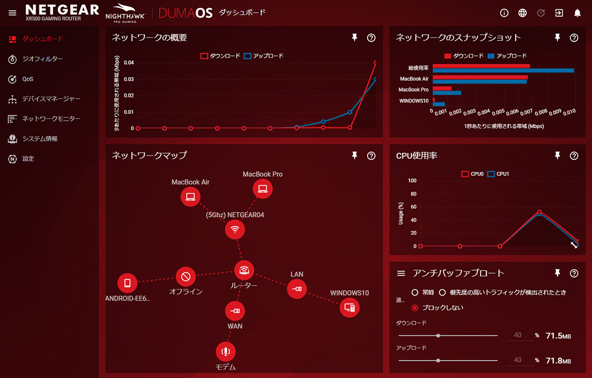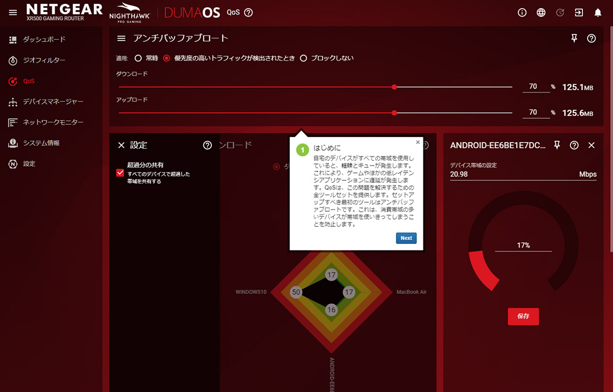 XR500の場合、この帯域占有の優先度設定をかなり細かく調整できる。まず1つ目は「アンチバッファブロート」と呼ばれるもので、あるデバイスやアプリケーションが、利用可能なネットワーク帯域を最大限に使ってしまうことを防ぐ機能だ。ルーターの最初のセットアップ時に実行したインターネット接続の速度計測時の数値をベースに、ダウンロード・アップロードそれぞれの速度について上限を設けることができる。