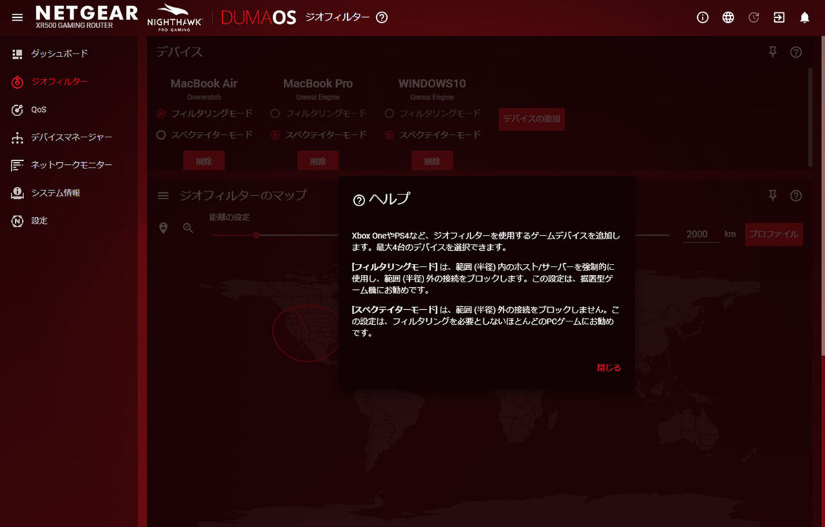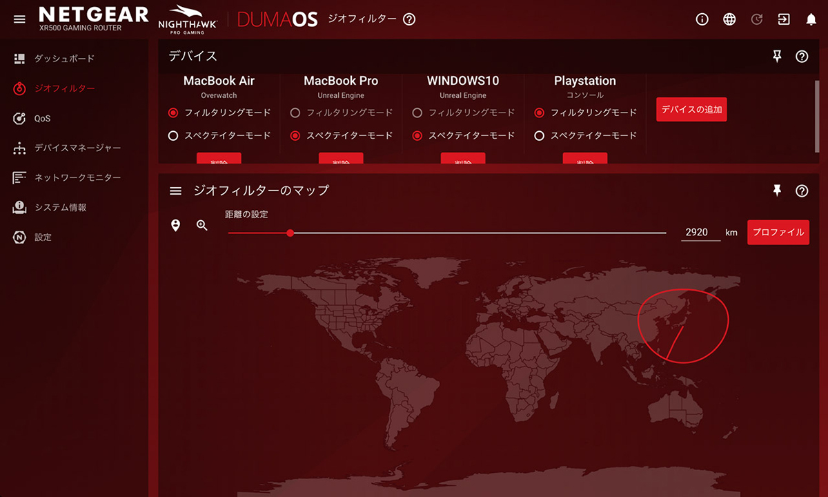 ジオフィルターの設定ページ。「デバイス」で接続しているデバイスごとにフィルターの有効・無効を設定する