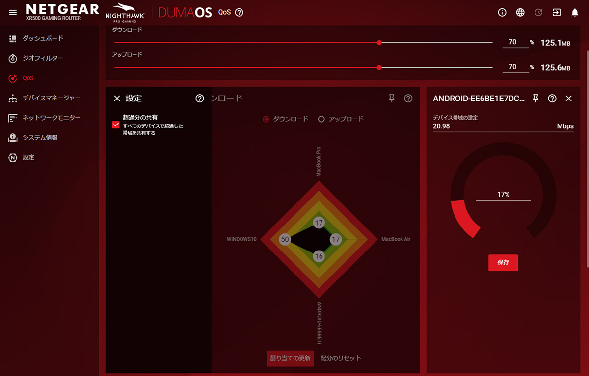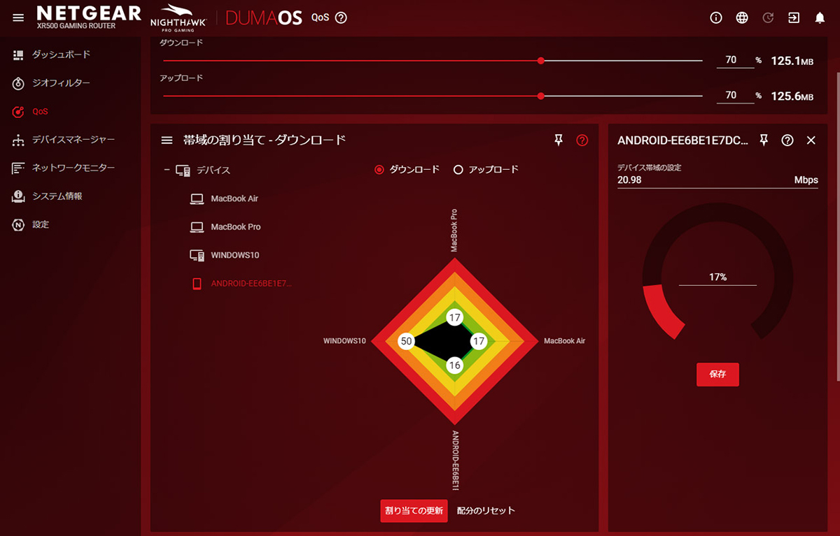 ところで、人によってはLAN内のPCをすべて一律で制限するよりも、PC個別に通信速度上限を決めたいときもあるだろう。ゲーム用PCは高速に通信させたいけれど、攻略サイト閲覧用のPCやスマートフォンは低速でいい、という考え方もあるはずだ。そういう場面で便利なのが「帯域の割り当て」設定。XR500に接続しているデバイスそれぞれの帯域占有バランスを、レーダーチャートのドラッグ操作で簡単に決定できる。