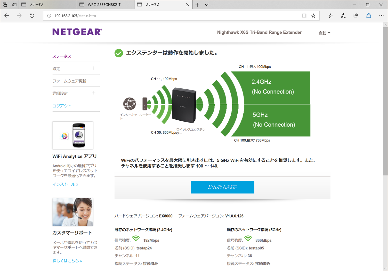 上の画面の状態から2階のEX8000の電源をオフ。すると、3階のEX8000の接続先(左下の扇型)がCH100(無線LANルーターのチャネル)に自動的に変更された