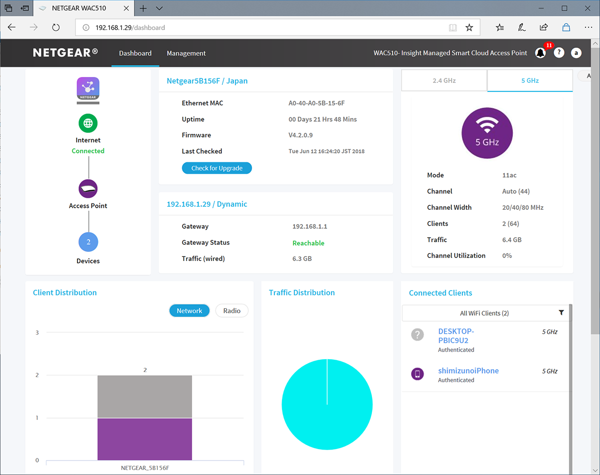 設定画面にアクセスした直後に表示されるダッシュボードでは、インターネットとの接続状況、現在の無線LANのチャネルや接続クライアント数、2.4/5GHzの周波数帯ごとの接続クライアント数、接続しているクライアントの一覧、時間帯ごとの接続台数やトラフィックの状況などを、わかりやすいグラフを交えて表示することができる。