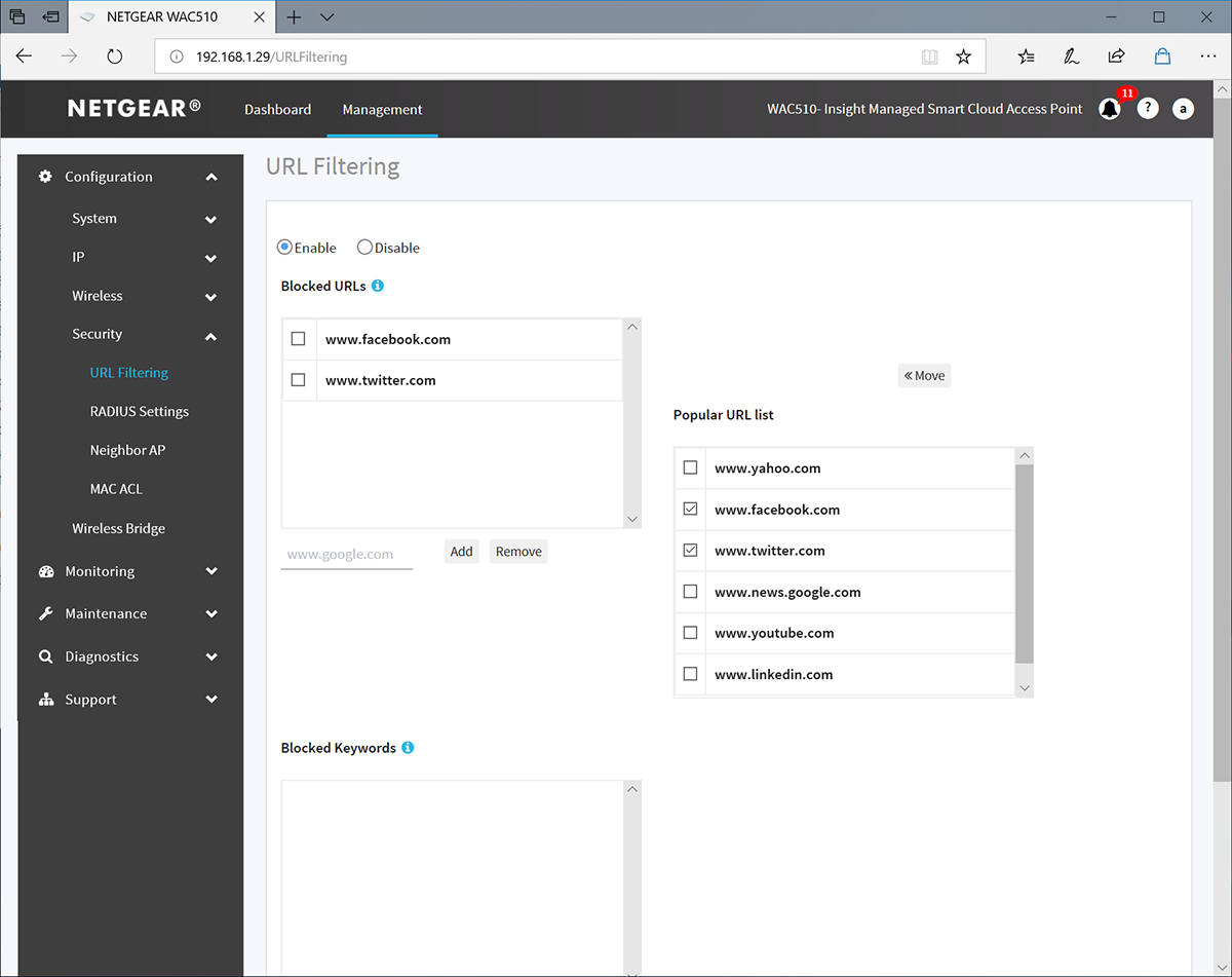 また、URLフィルタリング機能を内蔵しており、FacebookやTwitterなどのURLやキーワードを指定して業務に関係のないサイトへのアクセスを遮断することも可能だ。