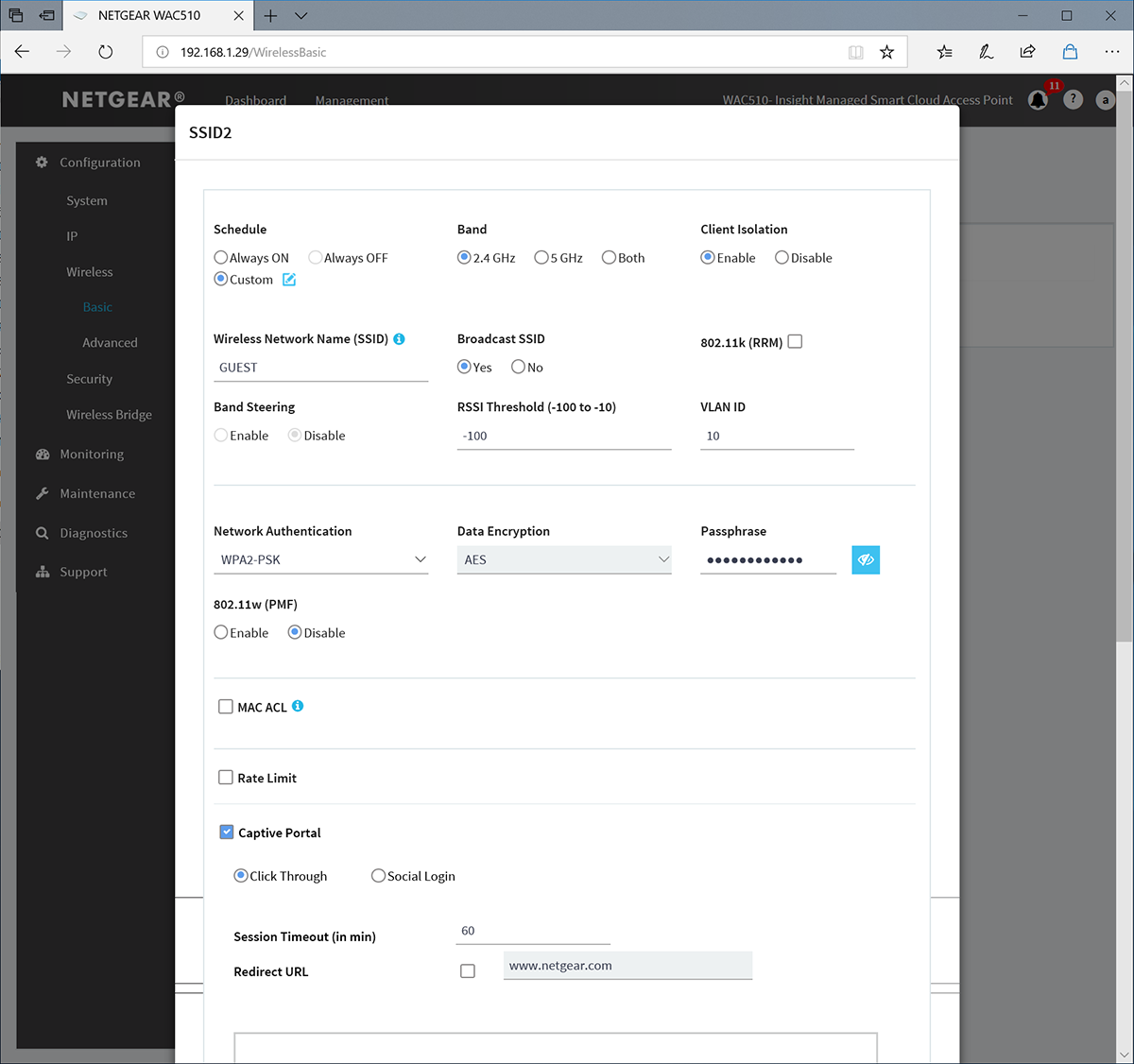 ゲスト用に細かな設定も可能で、たとえば接続可能なスケジュールを営業時間のみに設定したり、接続可能な周波数帯を2.4GHzのみに制限したり、クライアント同士のアクセスを禁止したり、接続後の転送速度の上限を設けたりすることもできる。