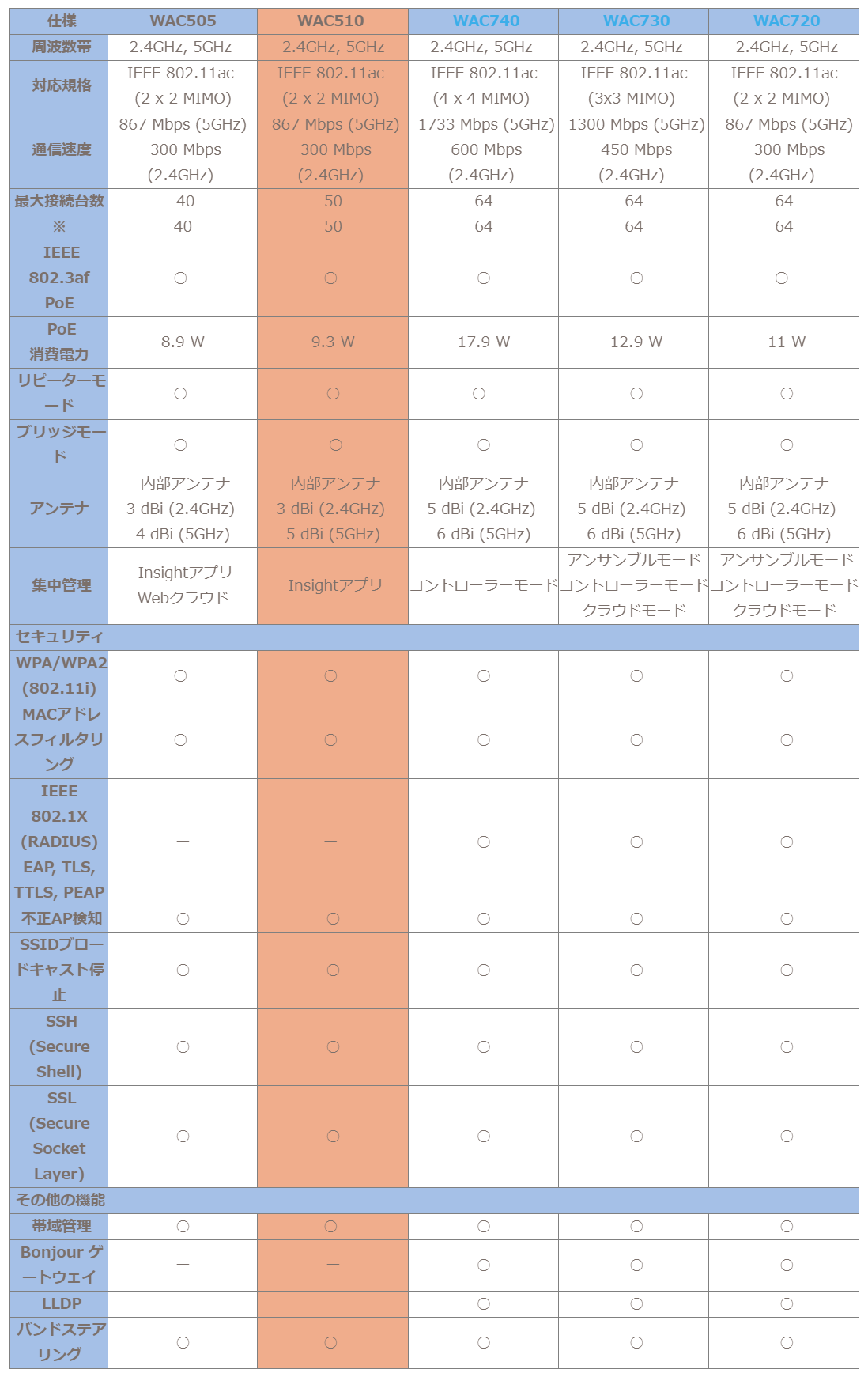 なお、ここまでWAC505/WAC510を並列でチェックしてきたが、両製品の違いは以下の表のようになっている。大きな違いは、WAC510はルーター(DHCP)としても動作させることが可能である点、接続台数が50台と多い点がなどが挙げられる。