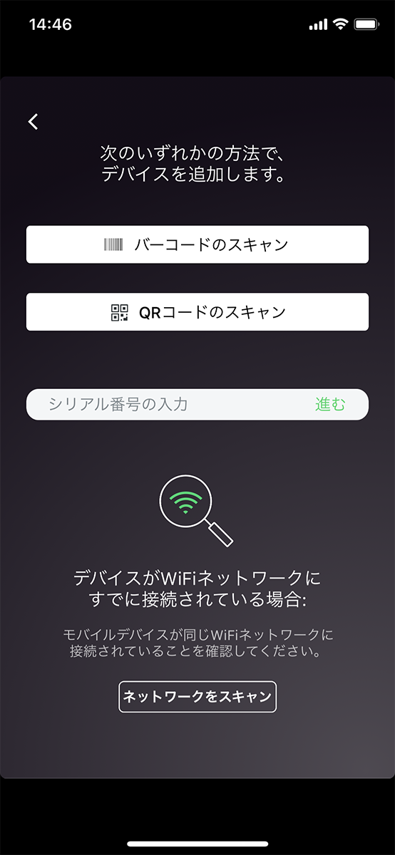 本体背面のバーコード、もしくはQRコードをアプリで読み取るか、同一ネットワークにスマートフォンを接続(他のアクセスポイントでネットワークが構成済みの場合)し、自動的に検出された一覧から機器を選択すると管理対象として登録することができる。